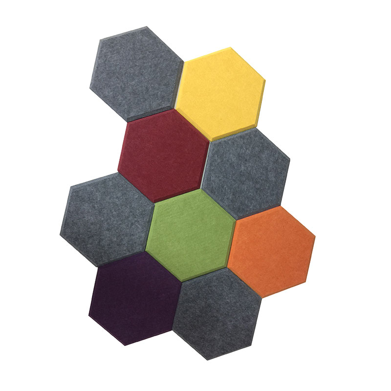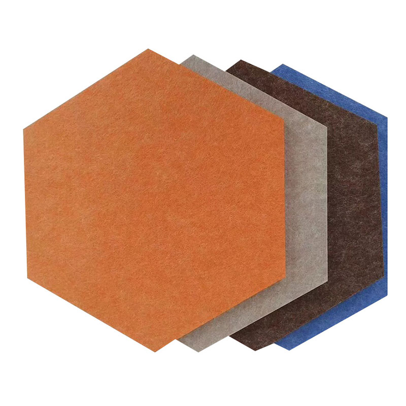Panel Felt PET Akustik digawe saka 100% polyester, dening pangolahan punching jarum. Proses produksi rampung fisik & ramah lingkungan, ora ana banyu limbah, emisi, sampah,. ora adhesive, Sifat keropos saka panel akustik ndadekake swara nyerep & insulative termal karo fitur saka Non-beracun, non-alergi, non-irritant lan ora ngemot binders formaldehida lan NRC dhuwur: 0.85
